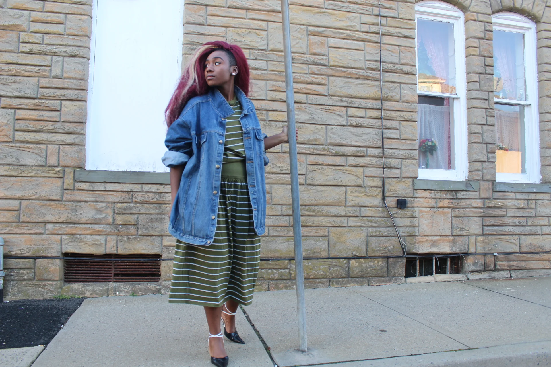However this look below is more on the conservative side. A matching coordinated set purchased at Goodwill. A look that I decided to shoot in the most editorial way, and to pair with Adidas. Instead I paired the set with the "aunty gator" heels. hahah Chuckling at the description these low heels have a point that is sharper than a sharks tooth. We call the African men who wear their dress shoes with a massive point gators. A 90s mod, vintage vibe, meets eclectic, afro, contemporary. I don't have any children yet, but I do believe I will be that mother slay daily. I will be the mother that arrives super late causing a scene to all of the school events with my fur and heels in ensemble. Here is the full look below enjoy, don't hesitate to comment, share, and encourage.