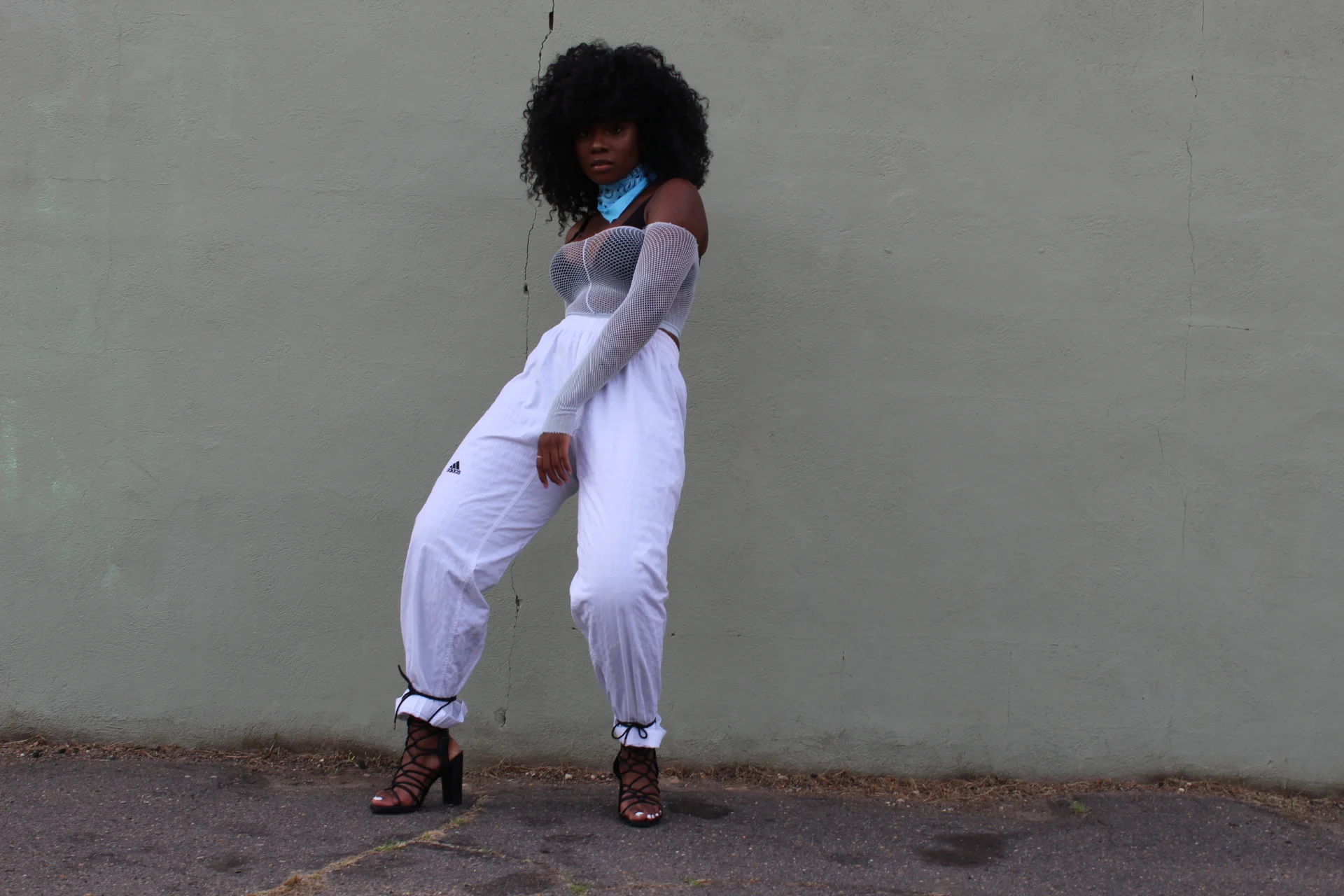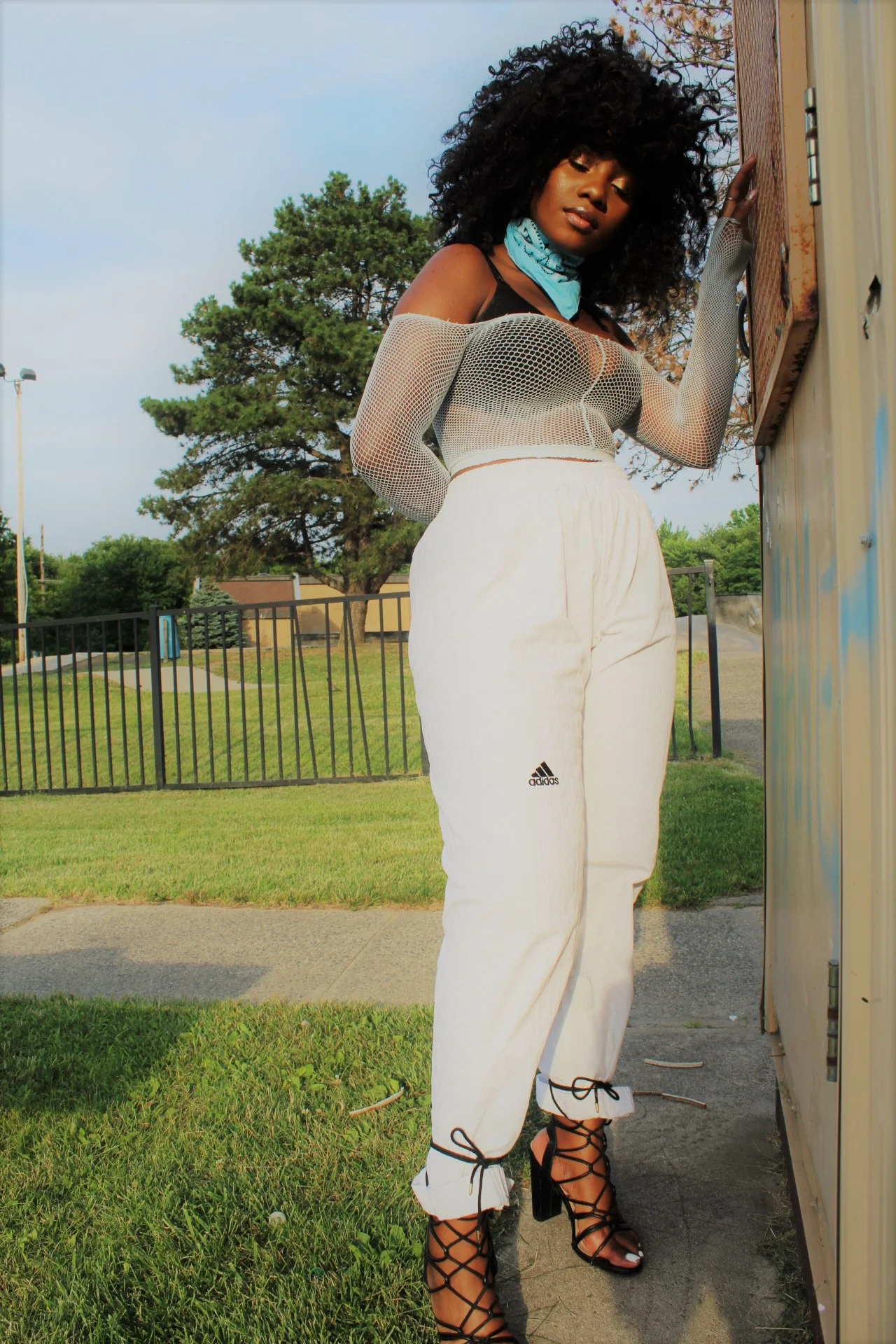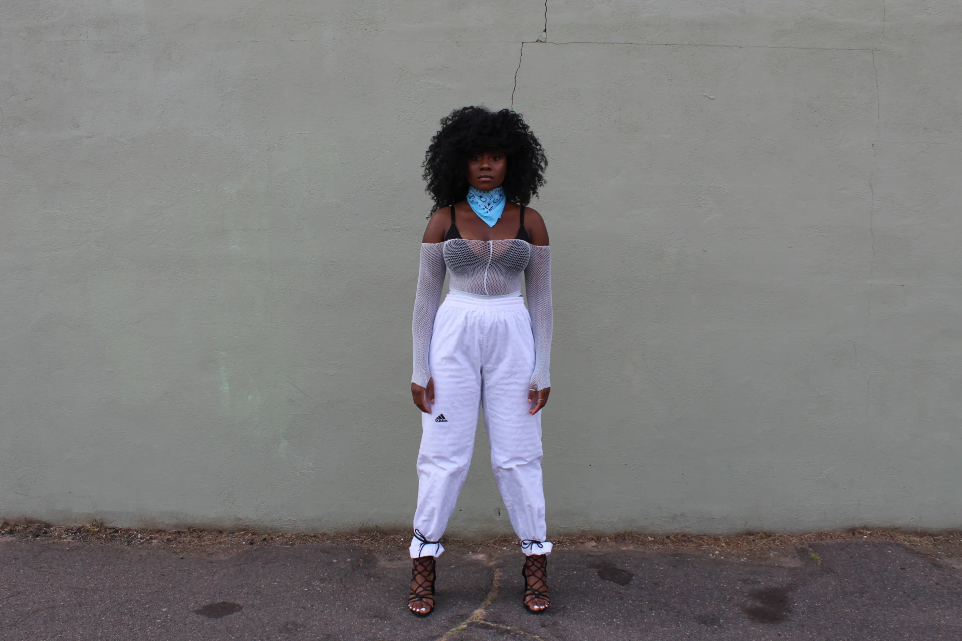 This mesh top was a DIY. MonicaStyleMuse and Ms.RayeRaye actually put me on to this life hack back in the day. Turning your tights into a top. I did it a few times but with my ICEcapade theme going on, I thought it would be nice to invite my ice blue mesh tights. Fishnet tights have made a debut into the trend pool. Wearing them under jeans exposing the top part of the tight. I know I wasn't really into that trend so I decided to revert back to the old days where we turned tights in to tops. It's still on trend being that off-shoulder everything has taken over the racks and everything is sheer these days. No privacy as we welcome the world into our exposed body parts as they are still covered under garments.