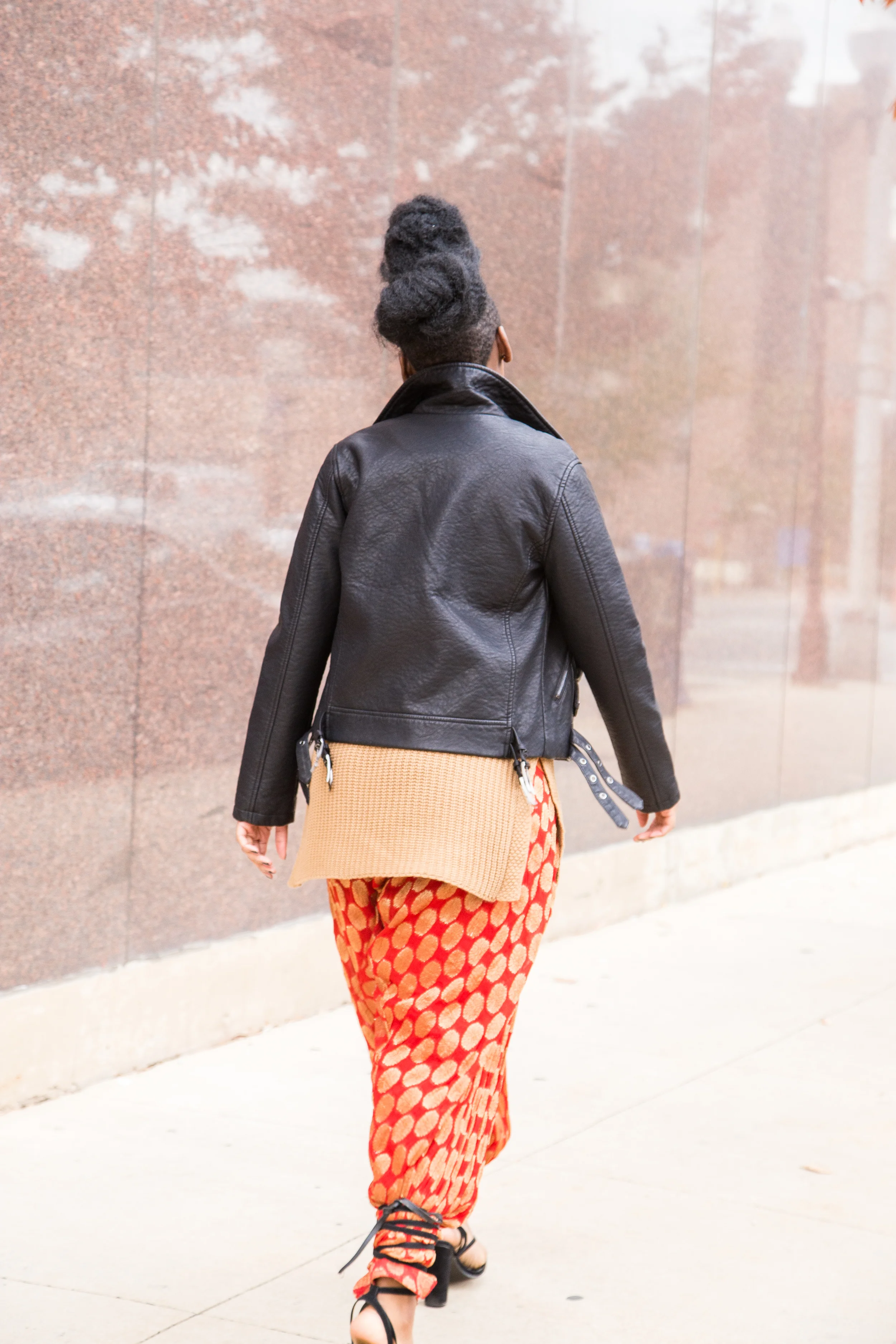 Moreover, I recently made the world's greatest purchase. I bought myself a red, faux leather jacket from Buffalo Exchange in NYC. I made everyone guess the retail price every time they asked me where I got it from. Can you guess it? Well, I'm just going to shout it out, retail price for nine bucks!!! Yup, that's right not ten dollars but nine USD!!! The excitement I felt was unreal. To the point I wore it two weeks straight with almost everything. Then bae said it was time to retire my jacket. All laughs, in actuality it was time to hang up my rouge jacket and get myself a noir moto jacket.
