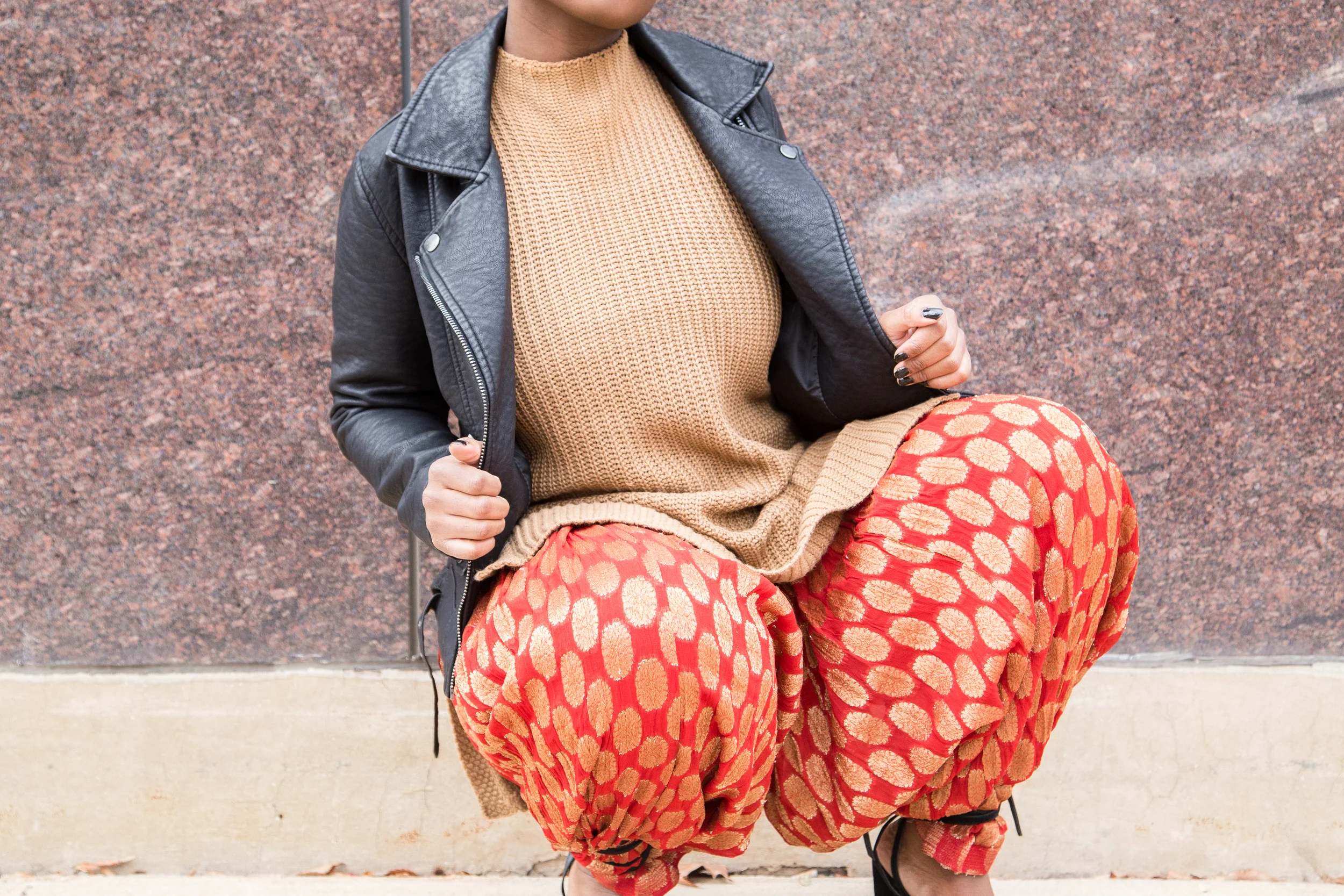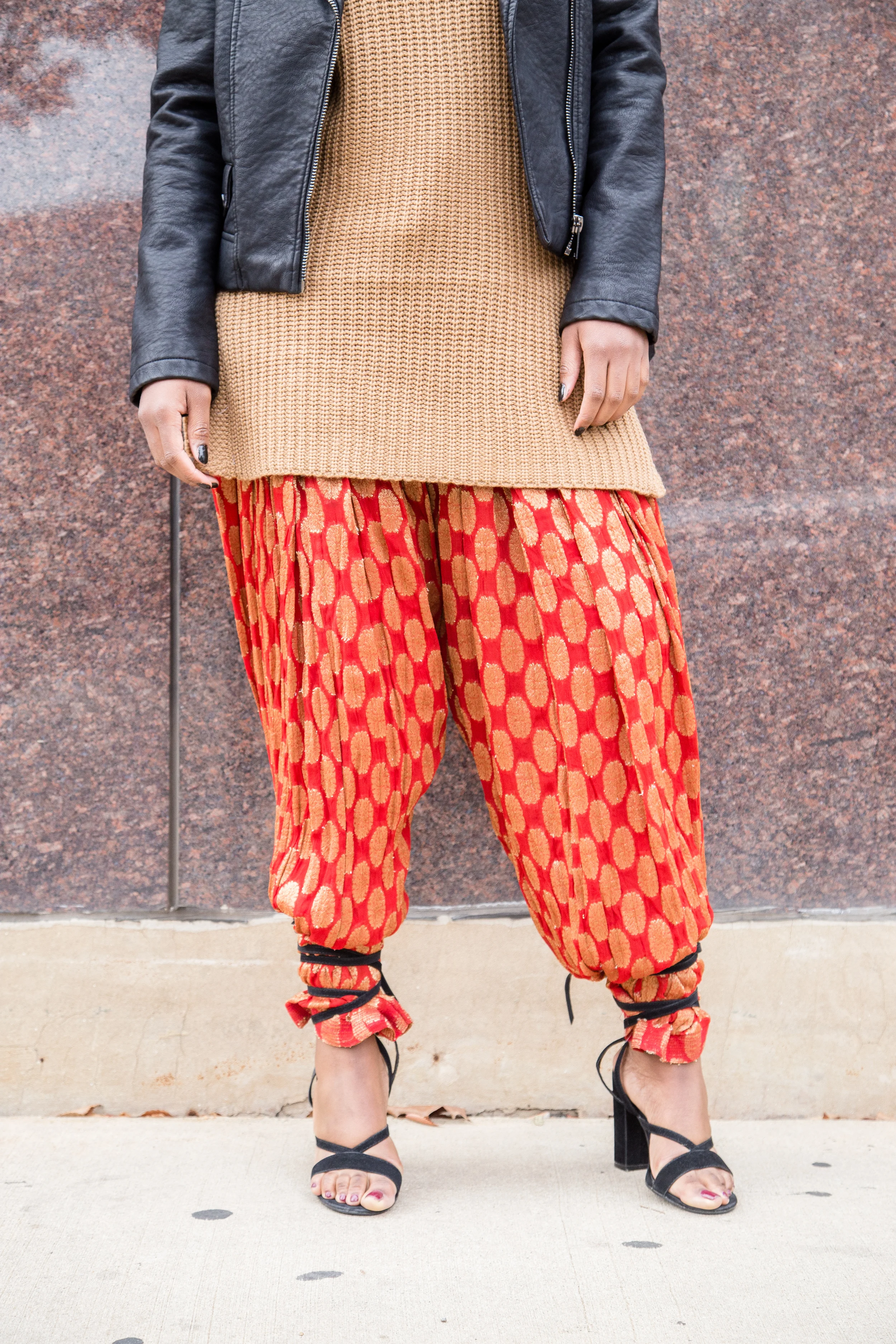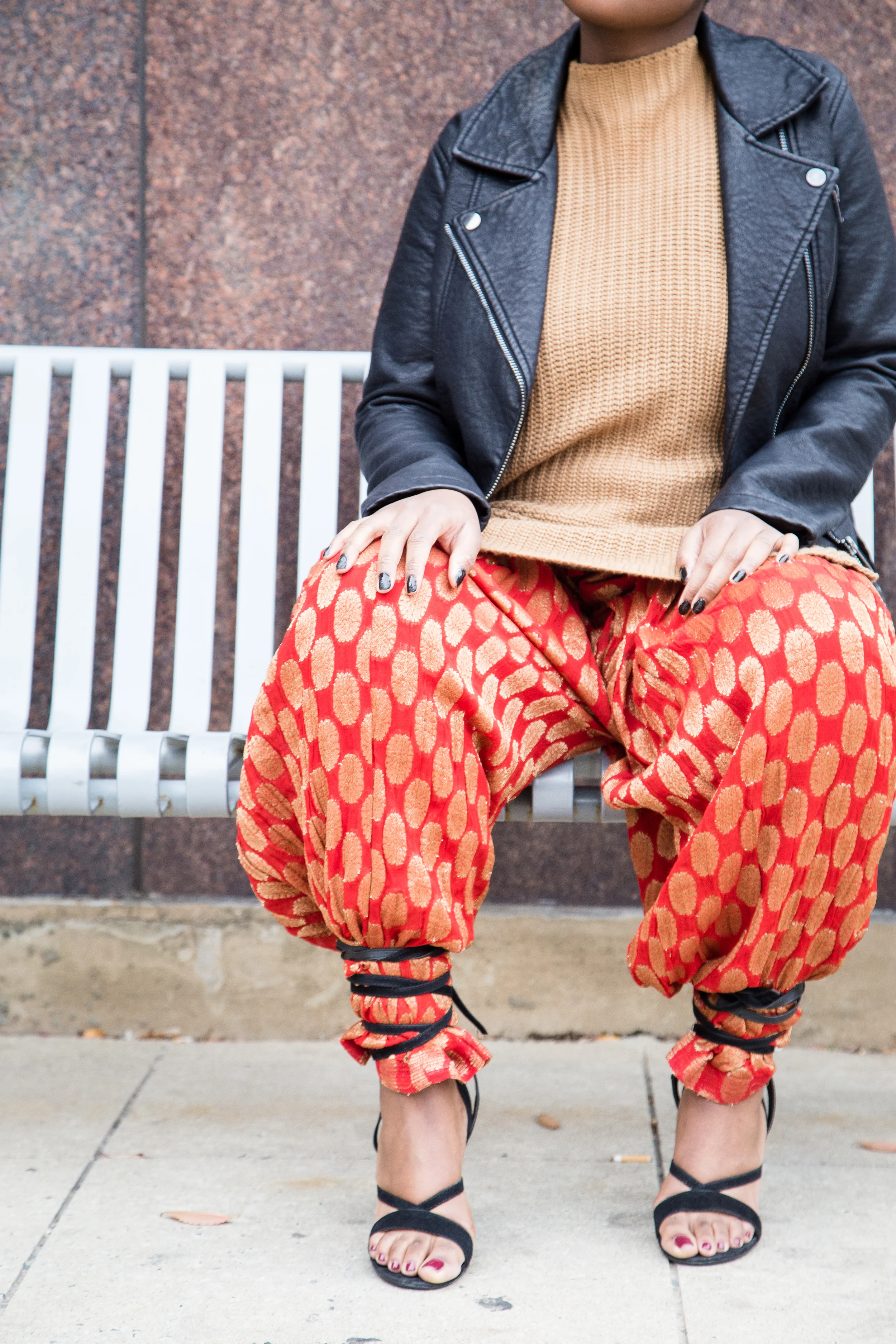 The biker jacket is used as an accessory in this look to tone it down a bit. In addition to giving this look an edgier vibe. My obsession with harem pants is outrageous. I own three harem pants, all from the Indian culture/fashion. This is an accessible item that I can just style various ways. Harem trousers are comfortable to wear. I love feeling the breeze as these trousers flow in the wind. I feel like an "Easy breezy, beautiful, Covergirl." From lounge-wear to evening wear. It has to be done properly in order for it to be worn at night.