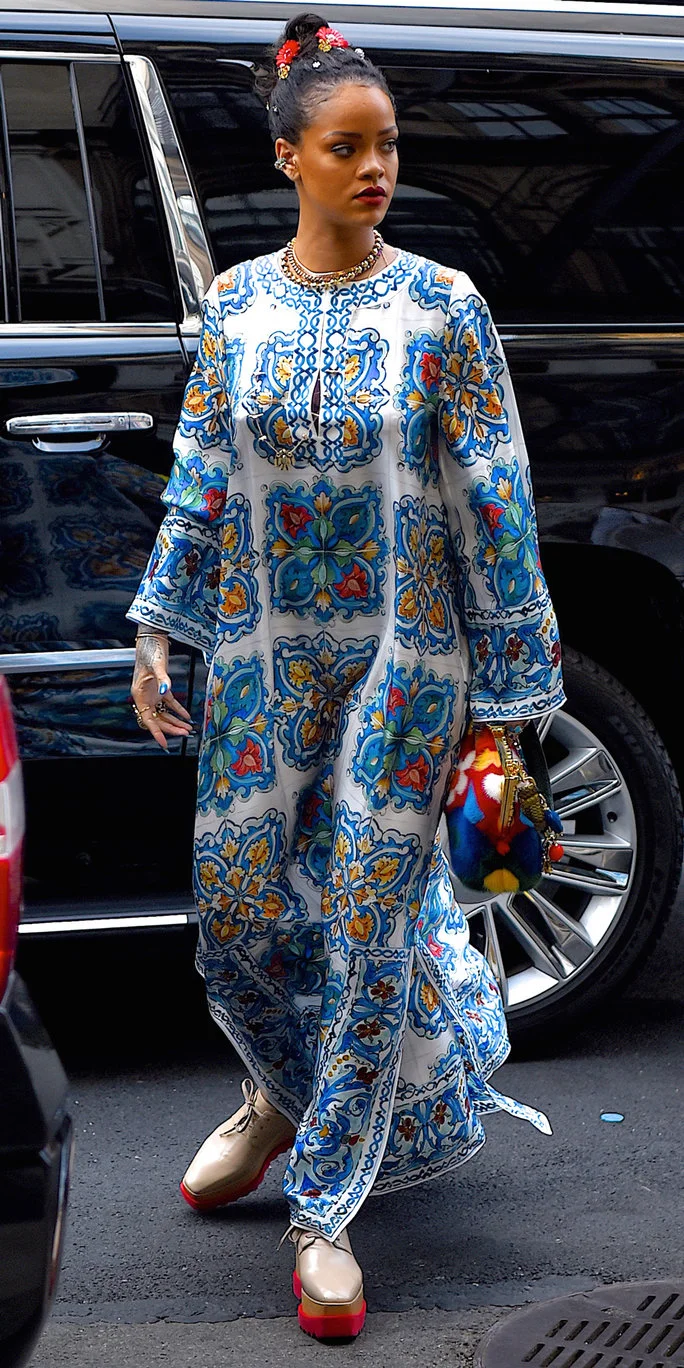 I love the garment don't get me wrong, yet it's irritating to see this type of representation in this way. Rihanna always looks fabulous in her daily dress. I am not a huge fan, but her style is always pleasing to witness. On the runway a European model wore this gown. Why not choose a model of color to properly display this garment. The point I am trying to make is that when a European person is seen wearing something cultural it is automatically "haute couture." When a celebrity starts to sport it, then the piece becomes a topic of discussion,