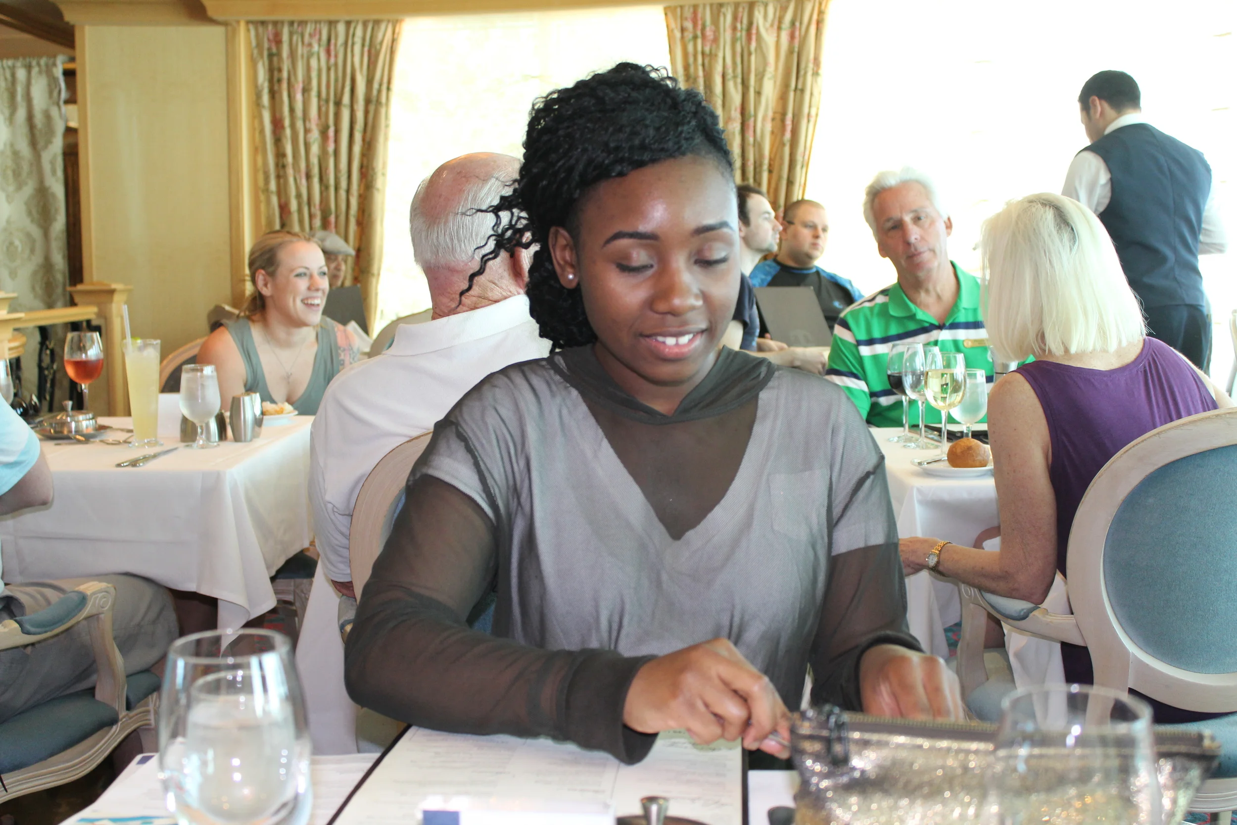 The meal was awful, I had cheeseburger sliders and my partner had pork chop. Talk about dry and tasteless. 3 course meal for free so why should I complain? The service was on point. Yet we were uncomfortable while the seating arrangements were extremely tight, no privacy. Literally touching the next table while they peek all in your food. Sad, to say we felt super uncomfortable, one table beside us you can tell were not fond of people of color. Here we are two young, African, lovers and first time cruisers who are excited to finally have a getaway. Let's just say dinner this night was cut short, we got dirt looks and strange stares from a mid age couple who clearly had an issue with us snapping photos and conversing with the table to our right who were such a lovely, elderly couple that has cruised before. Being we were so close to both tables, us being the only POC's in our section felt strange when this occurred. In that case we left and went to our Oceanside view room.